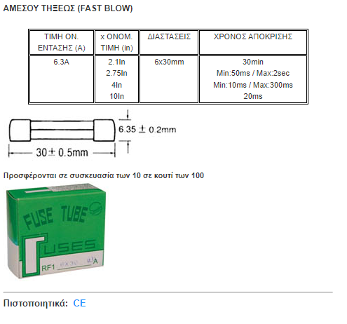 Κλασικές γυάλινες ασφάλειες, σε standard διαστάσεις των 5x20mm & 6x30mm,